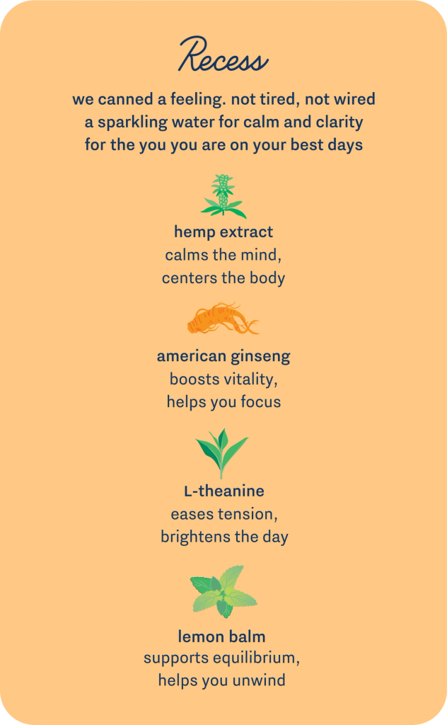 peach ginger a sparkling water infused with hemp & adaptogens to ease the day. brewed with real dried peaches & ginger Loading... Loading... Loading... Loading... having magnesium, adaptogens and electrolytes in one powder is a dream. The taste is great and satisfies as a post-workout thirst quencher. — kenny does wonders to keep me balanced during the day. helps me focus on things that matter, and tastes great. will be ordering again soon — sg being a high strung person, the calming effects were mild but effective! i got the gradient berry and will be purchasing more. — kay “i try not to drink at home, just socially, and Recess' Zero Proof line has really helped" — rick t. Recess in the press functional ingredients you can feel powerful compounds that help the body maintain calm & balance only the good stuff made with real fruit no fake things low calorie very delicious Learn More the Recess sampler sparkling water infused with a calming blend of hemp & adaptogens in all six flavors Shop as seen on instagram shop all Shop All