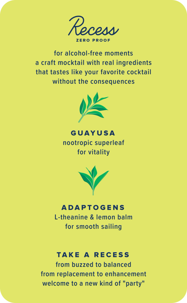lime “margarita” 0% ABV craft mocktail with uplifting guayusa & balancing adaptogens. tastes & feels like a fresh lime margarita with real agave & a touch of sea salt Loading... Loading... Loading... Loading... i pour them in my glass and drink away, guilt free and no hangover! — elizabeth “i try not to drink at home, just socially, and Recess' Zero Proof line has really helped" — alli k. this margarita flavor is absolutely FIRE 🔥 i will be in mourning when i run out — isabelle k. i used to go to bars, now i go to house parties & show up with a case of Recess Zero Proof — ella h. functional ingredients you can feel made with real ingredients, uplifting guayusa & balancing adaptogens, Recess Zero Proof is the perfect alcohol alternative only the good stuff made with real ingredients 0% ABV low calorie 5g of sugar or less agave-sweetened 10mg natural caffeine from guayusa learn more the Recess sampler sparkling water infused with a calming blend of hemp & adaptogens in all six flavors Shop as seen on social media shop all Shop All