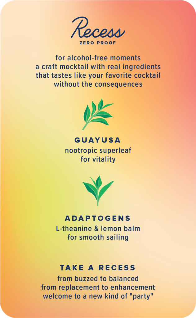made with real ingredients, uplifting guayusa & balancing adaptogens, Recess Zero Proof is the perfect alcohol alternative